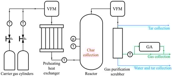 Schematic diagram of the pyrolysis reactor setup. Symbols: “p”—pressure measurement, “T”—temperature measurement, “VFM”—volumetric gas flow meters, and “GA”—gas analysers.