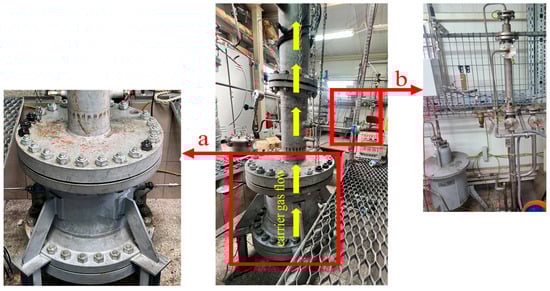 External configuration of the pyrolysis reactor setup: (a) main reactor chamber, (b) gas purification section.