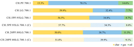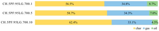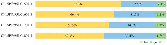 Figure 5 presents experiments performed on the 5PF:95LG at atmospheric pressure and temperatures of 500, 600, 700, and 800 °C. The results demonstrate that the char yield decreased from 65.3% to 52.3%, the gas yield increased from 27.6% to 39.4%, and the oil yield ranged between 7.1% and 8.7%. A clear inverse correlation between temperature and char yield was observed, while gas yield exhibited a direct correlation with temperature. These trends are consistent with results from studies on poultry feather pyrolysis [16,19,21] as well as lignite pyrolysis [41].