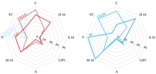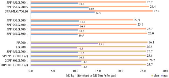 Comparing the LHV of the chars, CH.PF and CH.LG exhibited very similar values of 26.1 and 25.6 MJ kg−1, respectively. These values exceed those reported in the literature by approximately 4–5 MJ kg−1 [16,49].