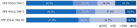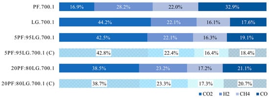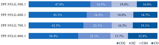 The analysis of the gaseous product composition, shown in Figure 8, indicates distinct characteristics of the gases produced from PF and LG. For tests conducted at 700 °C and atmospheric pressure, the dominant gas components from PF were CO (32.9%) and H2 (28.2%), with CH4 constituting 22.0%, and the smallest fraction being CO2 (16.9%). In the case of LG, the gas was predominantly composed of CO2 (44.2%), followed by H2 (22.1%), CO (17.6%), and CH4 (16.1%).