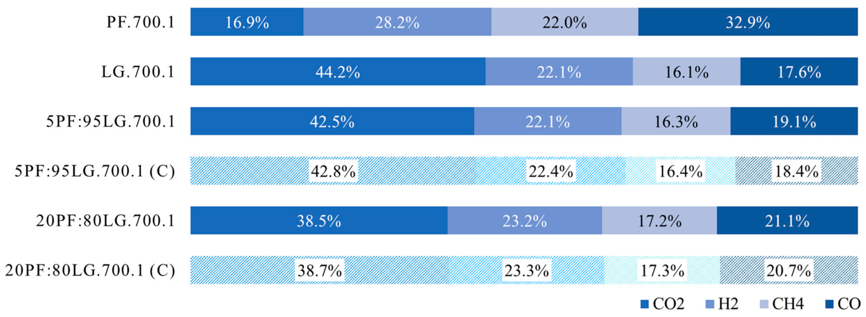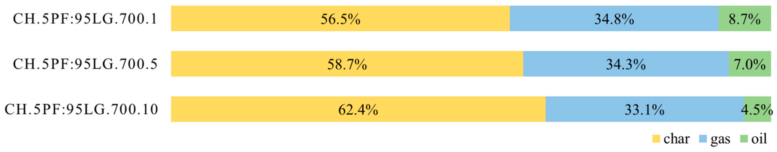 - The distribution of char, gas, and oil fractions in the 5PF:95LG and 20PF:80LG mixtures showed no evidence of interactions between PF and LG, contradicting the claims in [20] that co-pyrolysis positively affects solid matter retention.
