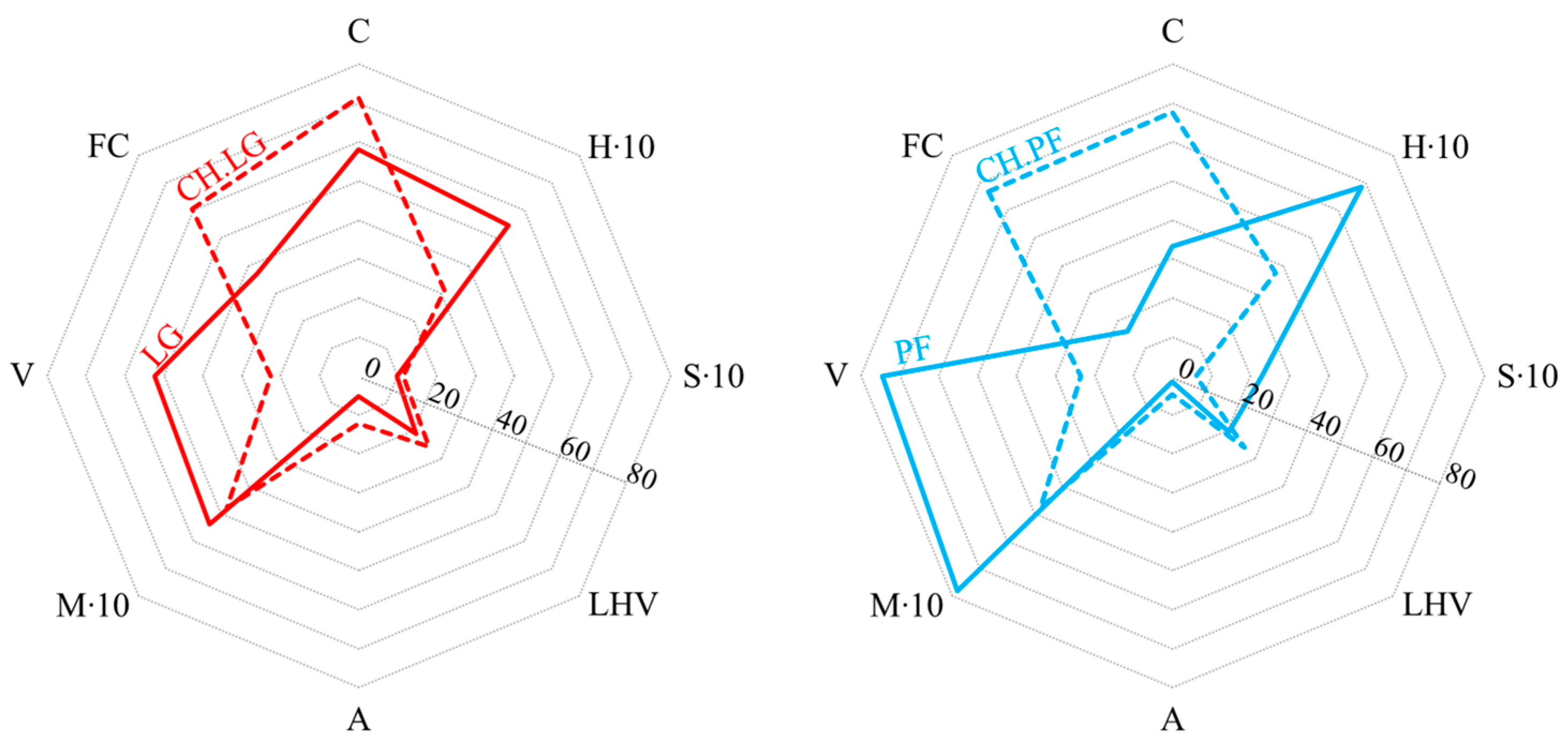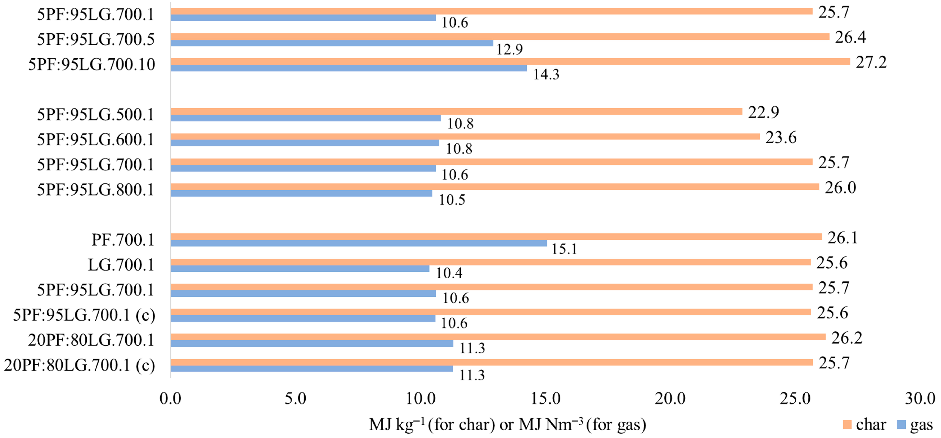 - Although PF and LG possess distinct physicochemical properties, pyrolysis produced chars with similar characteristics. Compared to the original feedstock, pyrolysis increased the LHV of the chars (26.1 and 25.6 MJ·kg−1), increased carbon content (67.7–71.4%), and decreased hydrogen (3.1–3.7%) and sulphur (0.6–1.2%) contents.