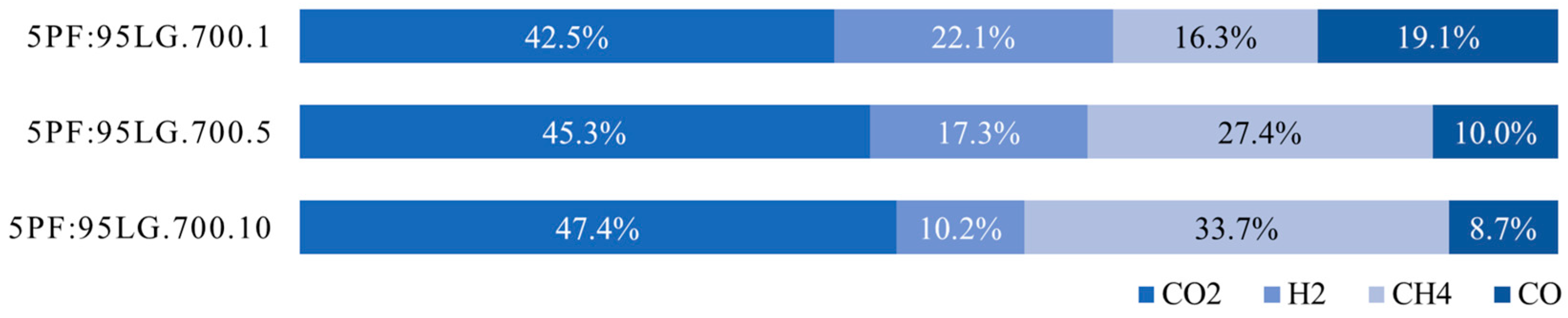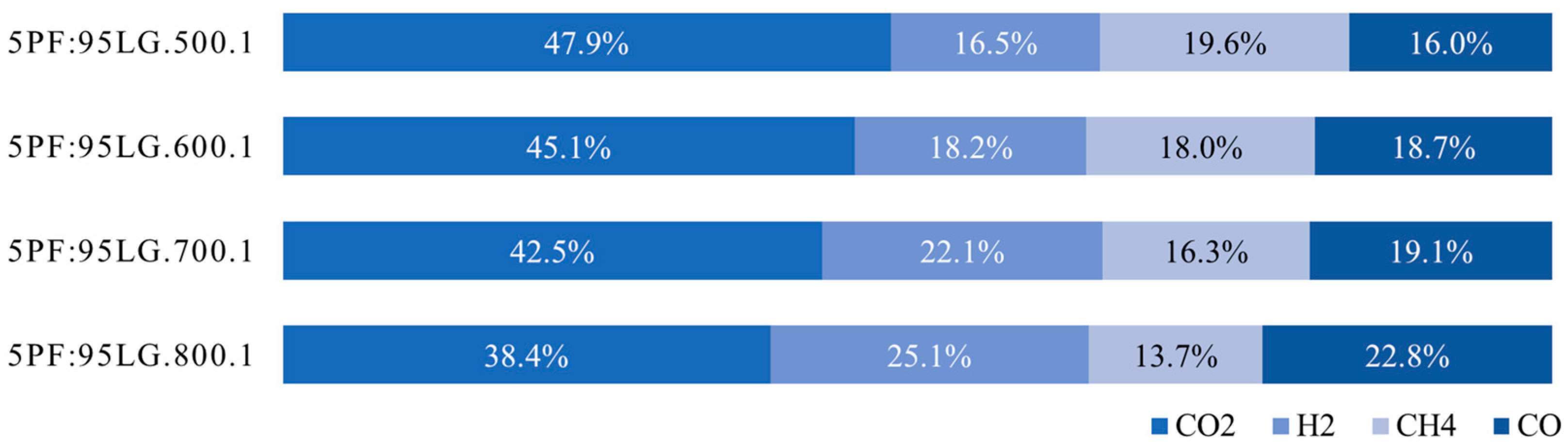 - Gases from LG pyrolysis were predominantly composed of 44.2% CO2, followed by 22.1% H2, 17.6% CO, and 16.1% CH4, consistent with literature reports [58].