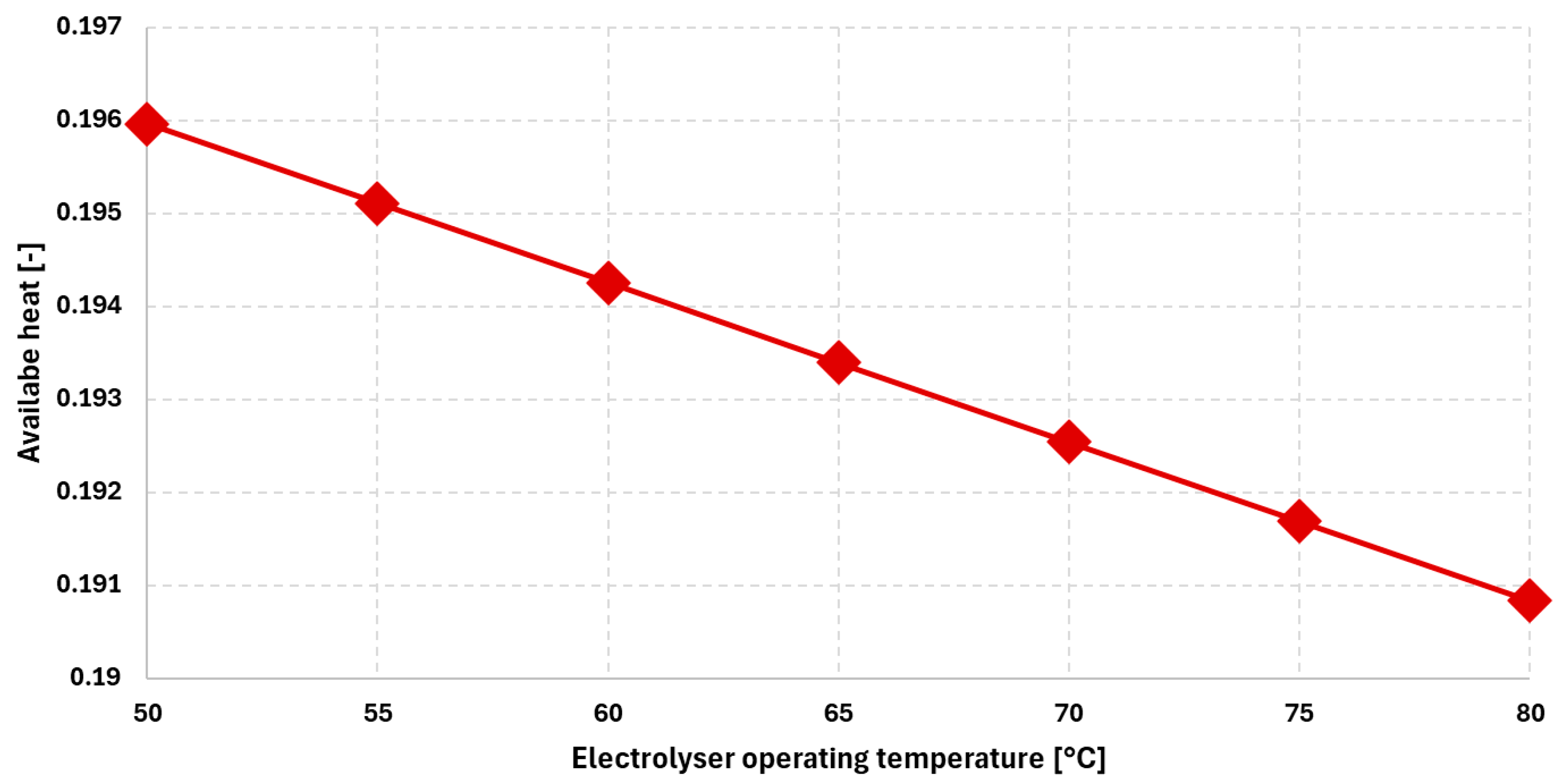 Figure 3, the available heat is expressed as a fraction of the stack power, which was considered constant in the calculation. By applying the aforementioned increase in the electrolyser’s operating temperature, the heat availability drops by 3%, from 0.196 to 0.19. The reason for this behaviour can be deduced from analysing the trends reported in