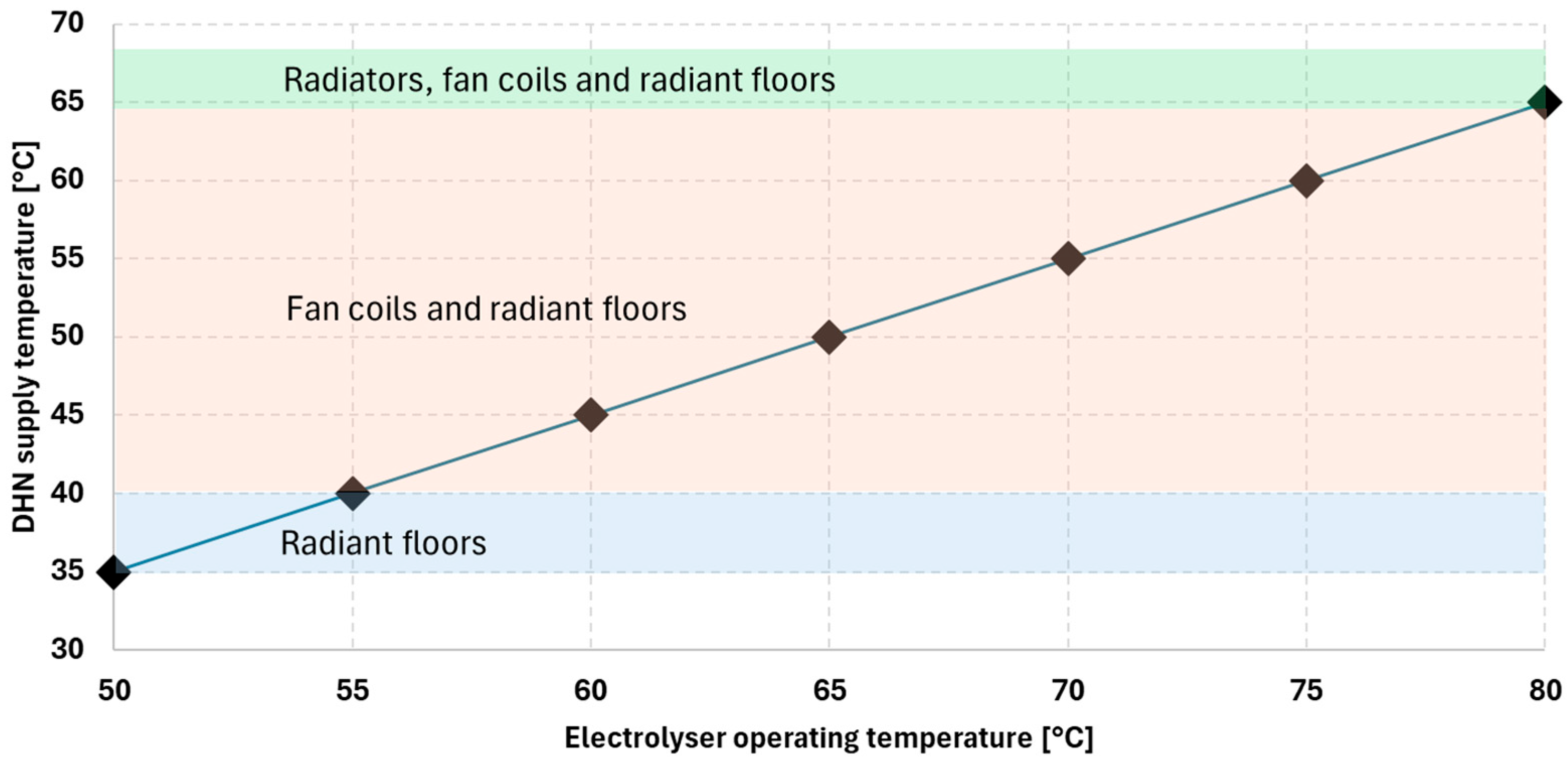 Figure 4 shows how the thermal level for commercially available electrolysers and heat emission terminals can provide a synergistic coupling between waste heat derived from cooling electrolysis units and low-temperature district heating networks. Such a virtuous waste heat utilization pathway could be pivotal for aiding residential heating demand decarbonization based on direct electrification strategies.