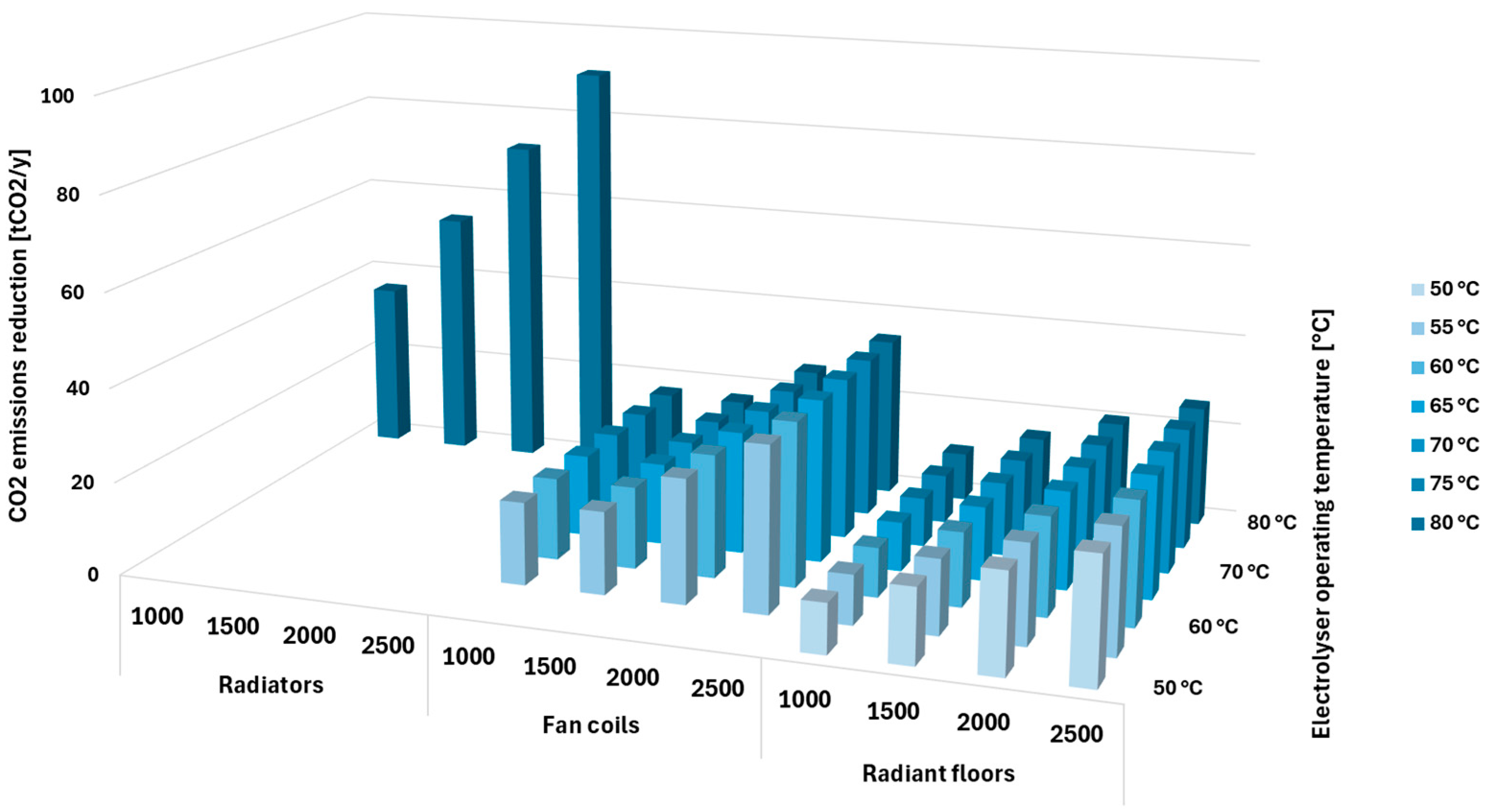 2 emissions reduction. For that purpose, a different heat generation system was assumed for each heat emission system. In detail, referring to radiators, it was assumed that the heat generation system consists of a natural gas boiler with a 90% efficiency. On the other hand, it was assumed that both fan coils and radiant floors are supplied by heat pumps, with COPs of 3 and 5, respectively. Obviously, as the electrolysis unit is powered by RES, the waste heat resulting from the electrochemical conversion is characterised by a null carbon footprint. Having said this, the calculation for the CO