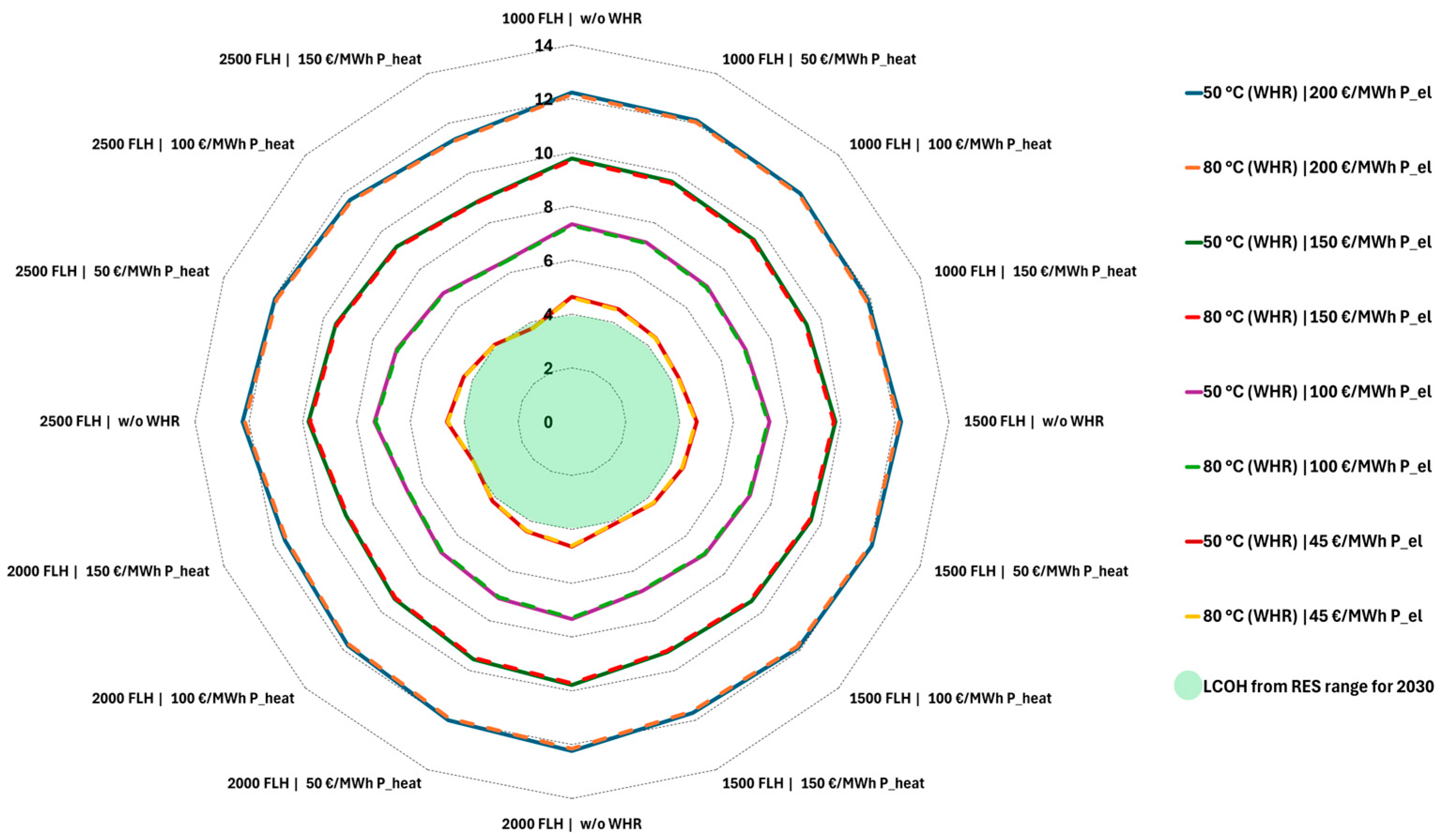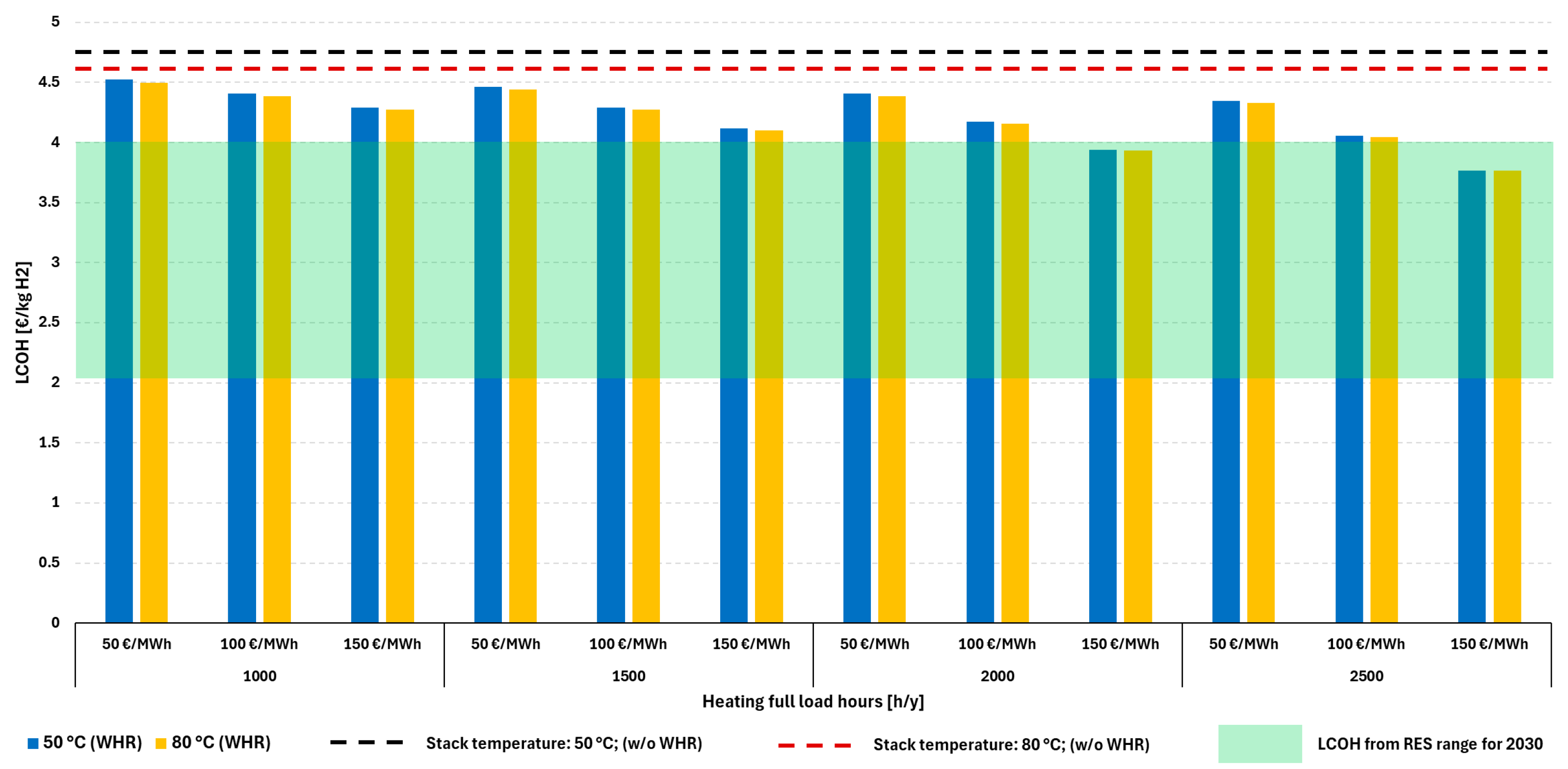 Figure 7), it is possible to determine how fluctuations in one of the most critical cost drivers, i.e., electricity price, affect the levelized cost of hydrogen (LCOH) and how synergistic effects with waste heat recovery (WHR) can mitigate these impacts.