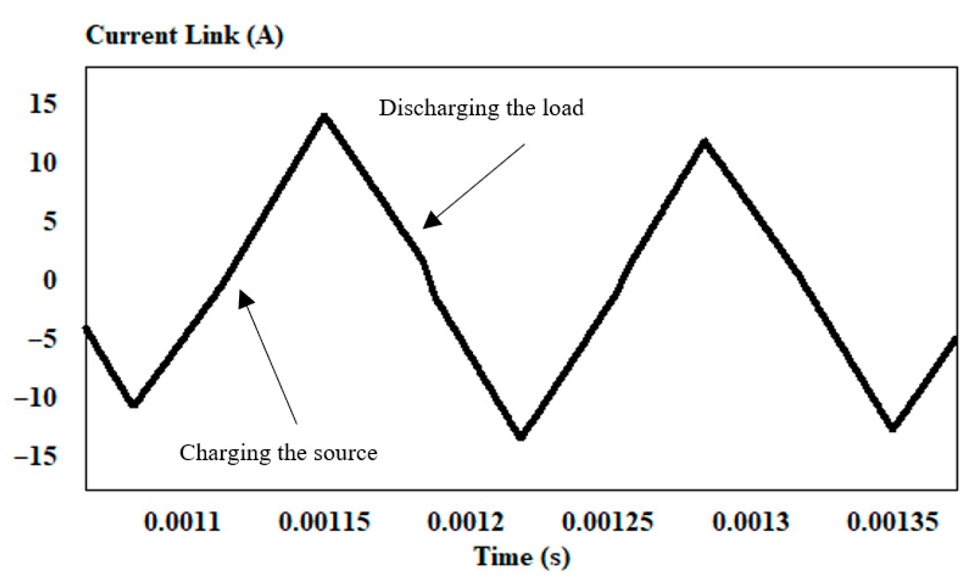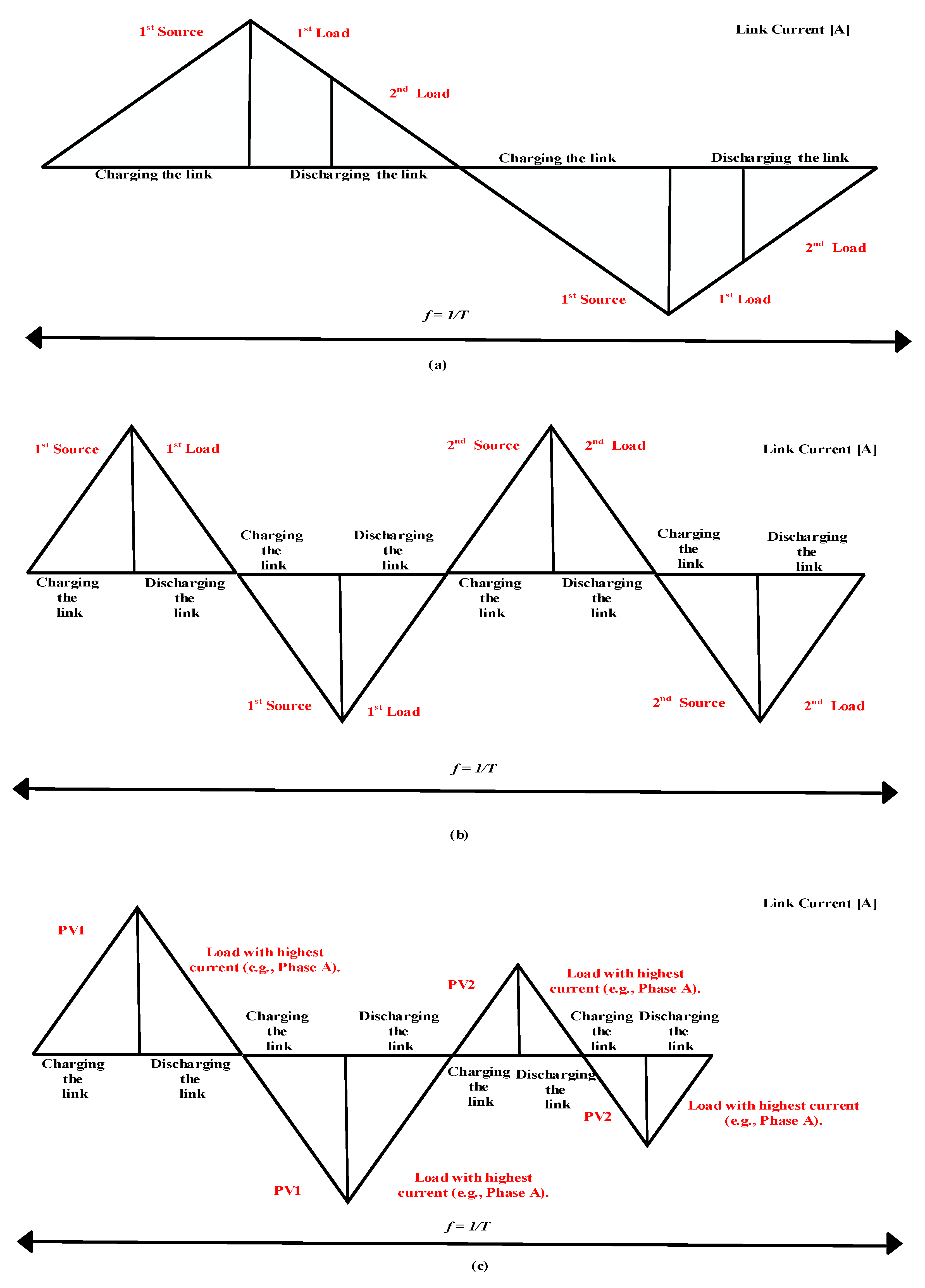 - Cycle execution: The selected source charges the link inductor, followed by discharging the stored energy into the selected load. The peak link current and mode timings are dynamically adjusted using Equations (4)–(7) and (11) to adapt to real-time power levels.