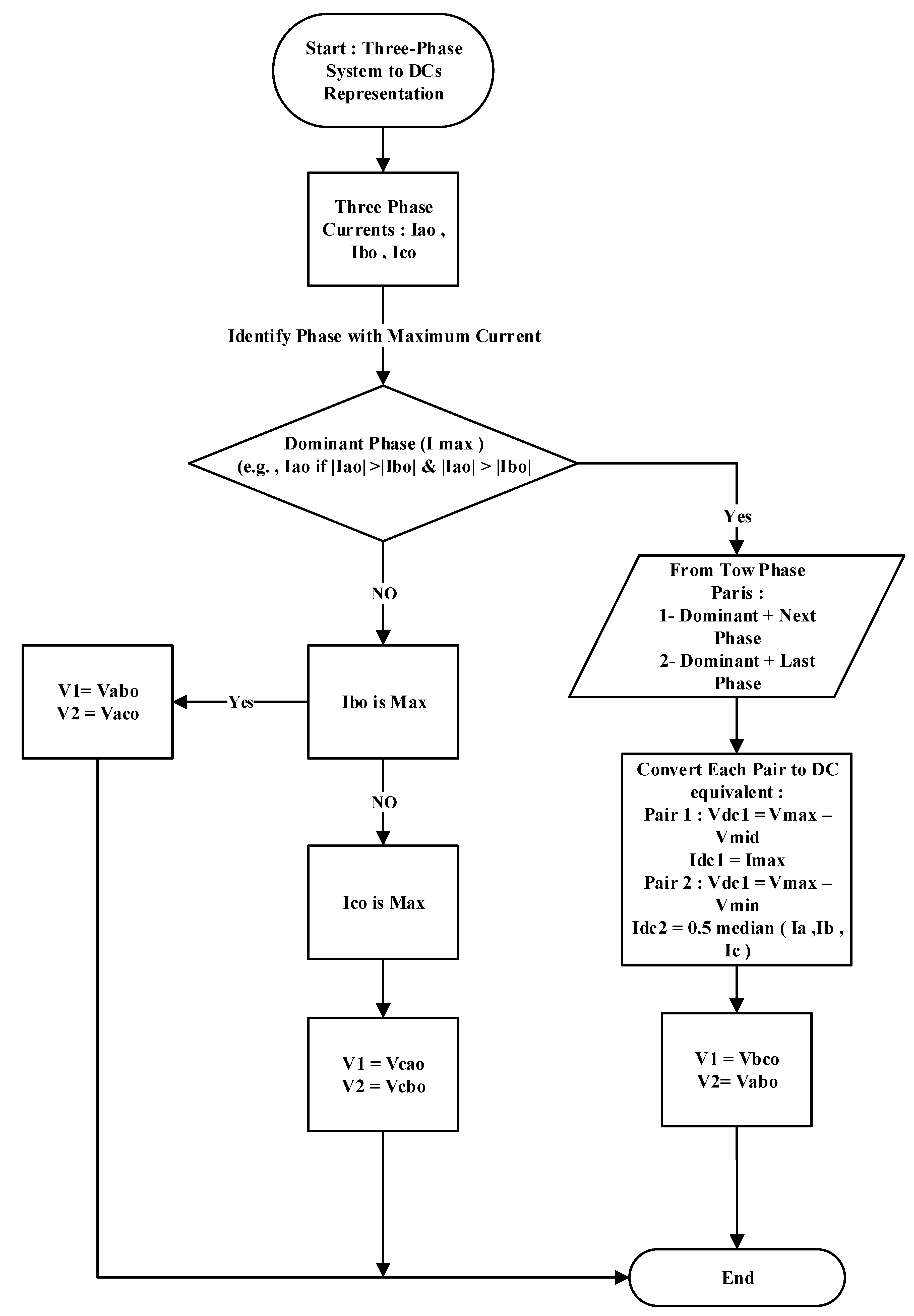 - DC equivalent conversion: Convert the three-phase system into an equivalent dual-DC system using the flowchart in Figure 5. The primary DC load (Pair 1) is characterized by = and = . The secondary DC load (Pair 2) is characterized by = and = median