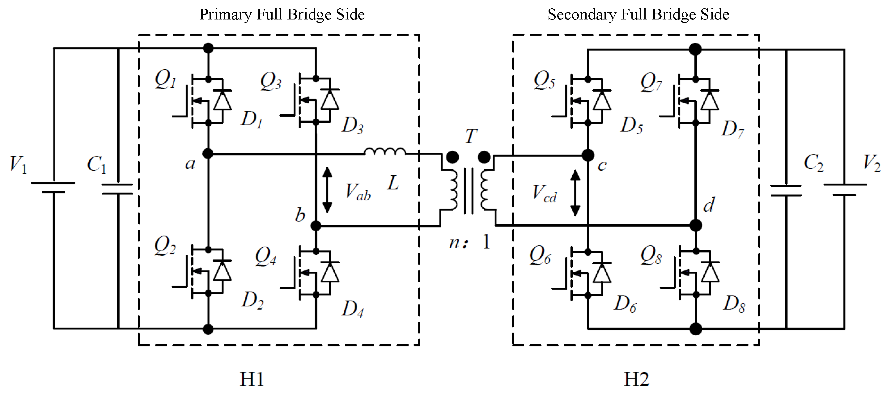 The DAB converter, depicted in Figure 1, features a symmetrical topology for bidirectional power transfer between two DC sources, V 1 and V 2 . The circuit consists of two full-bridge inverters, H 1 and H 2 , interconnected by a high-frequency transformer. The transformer provides galvanic isolation and voltage scaling via its primary-to-secondary turn ratio, n = N p / N s . An inductor L, representing the aggregate of transformer leakage and any external series inductance, serves as the primary energy transfer element. By generating high-frequency quasi-square-wave voltages, v a b ( t ) and v c d ( t ) , at their respective AC terminals, the bridges facilitate power exchange through the inductor current, i L ( t ) .