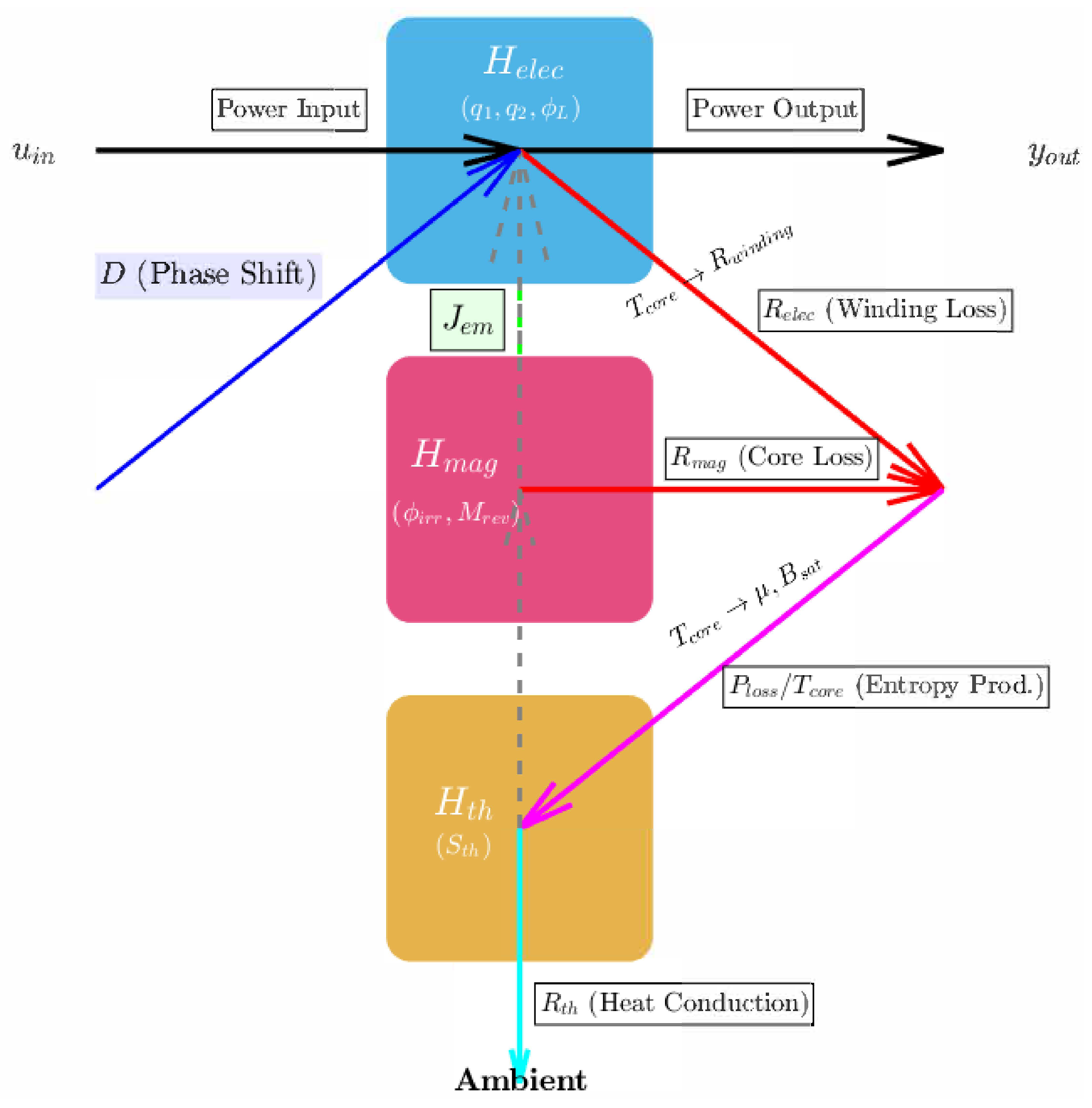 The framework of DAB converters is effective as it unifies the electrical, magnetic, and thermal domains into a coherent model. The total Hamiltonian for a coupled electro-thermo-magnetic model is the sum of the energies stored in each domain: