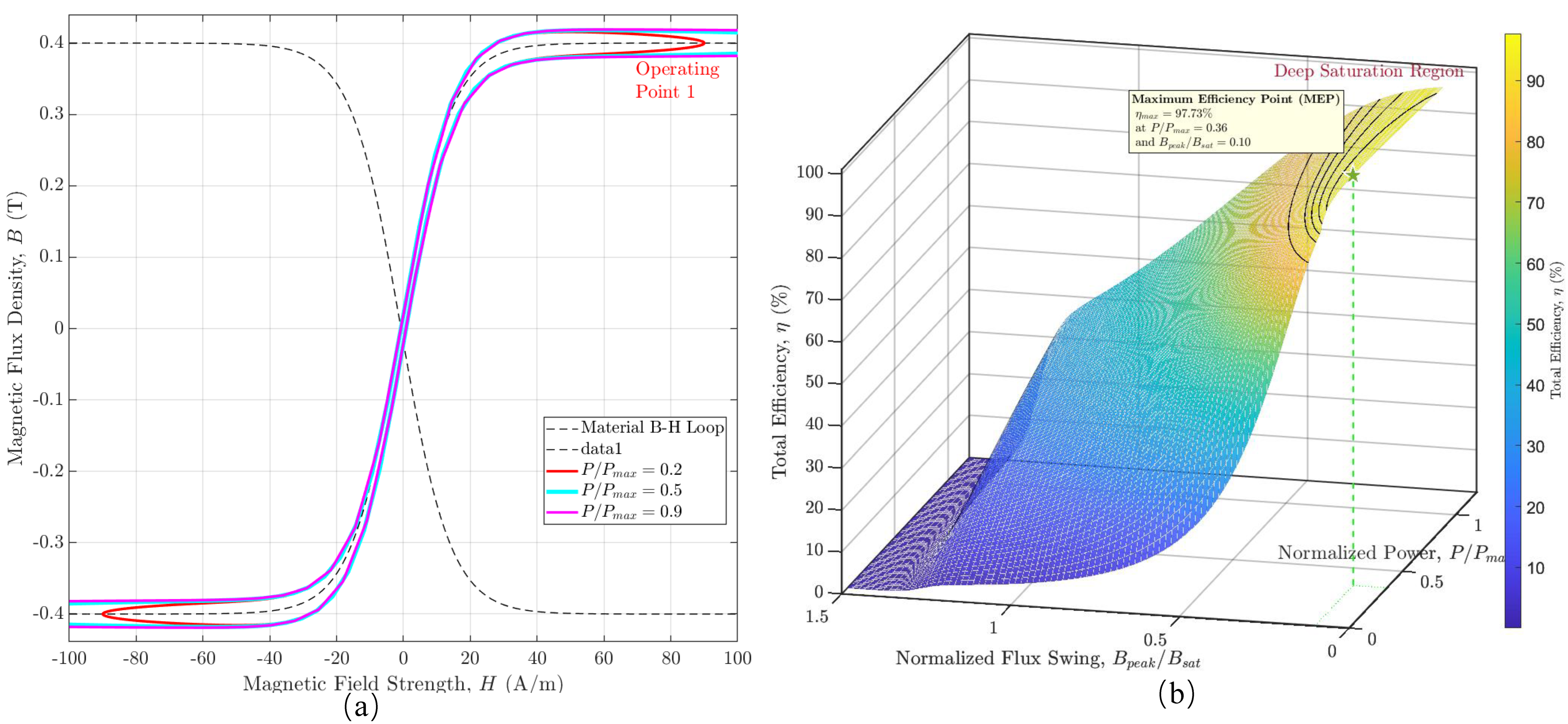 Figure 3 presents a compelling visualization of the operational dichotomy governed by the nonlinear physics of the magnetic core. In Figure 3a, each colored trajectory represents the magnetic core’s state evolution over a single switching cycle at a specific power level. At low power ( P / P m a x = 0.2 ), the operational loop is small and confined to the linear region of the B-H curve, indicating minimal core losses and low magnetizing currents. As the power demand increases ( P / P m a x = 0.9 ), the trajectory is forced to expand, encompassing a significantly larger area. The geometric expansion is a direct visual analog to increased hysteretic and eddy-current losses. Critically, at high power levels, the loop’s apices extend into the knee of the B-H curve, signaling the onset of magnetic saturation. This visualization transforms the abstract concept of power transfer into a tangible magnetic stress test, where the area enclosed by the operational loop serves as a direct proxy for the per-cycle energy dissipated within the core.