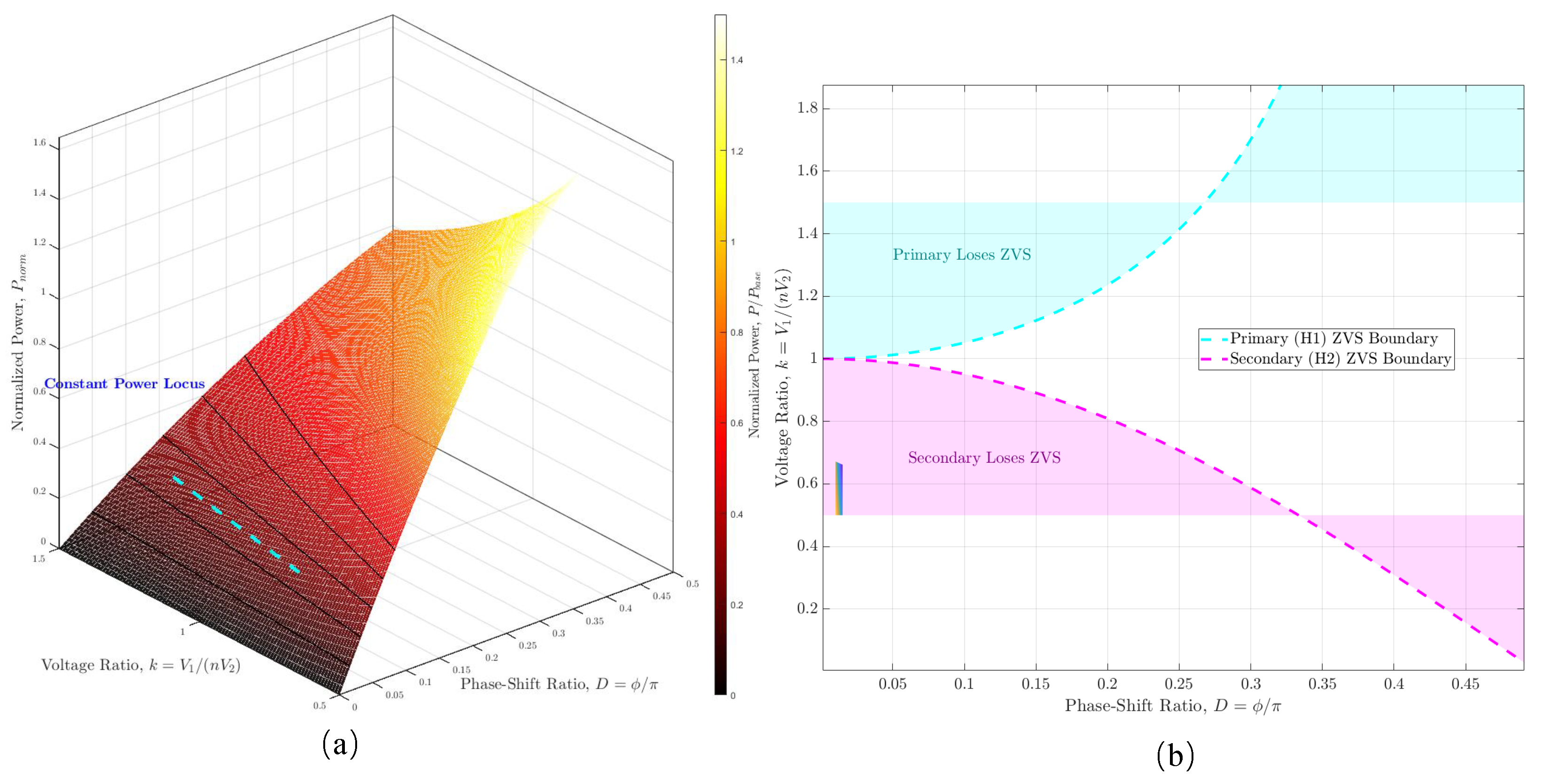 Based on the Eeectrical model, Figure 5a depicts the power manifold, a three-dimensional surface illustrating the normalized power throughput P n o r m as a function of D and the voltage conversion ratio k. This geometric representation, derived directly from the system’s PHM, reveals the fundamental control-to-output mapping. The surface’s topology delineates the achievable power for any given operating condition, while overlaid iso-power contours define the control trajectories necessary for regulation. The highlighted constant power locus exemplifies a practical control law, tracing the path the controller must navigate in the ( D , k ) space to maintain a constant output power despite variations in the voltage ratio. Figure 5b translates this parametric understanding into a practical design map by projecting the performance onto ZVS operational plane. The dashed lines represent the critical boundaries for achieving soft switching, a prerequisite for high-efficiency operation. The cyan boundary delineates the region where the H 1 maintains ZVS, while the magenta boundary does the same for H 2 . The shaded areas thus represent hard-switching regions, where switching losses increase dramatically. The intersection of the two ZVS-enabled regions defines the optimal operating corridor. The figure illustrates the inherent design trade-off: maximizing power throughput, which often requires larger values of D, can push the operating point across the ZVS boundaries, thereby compromising efficiency.
