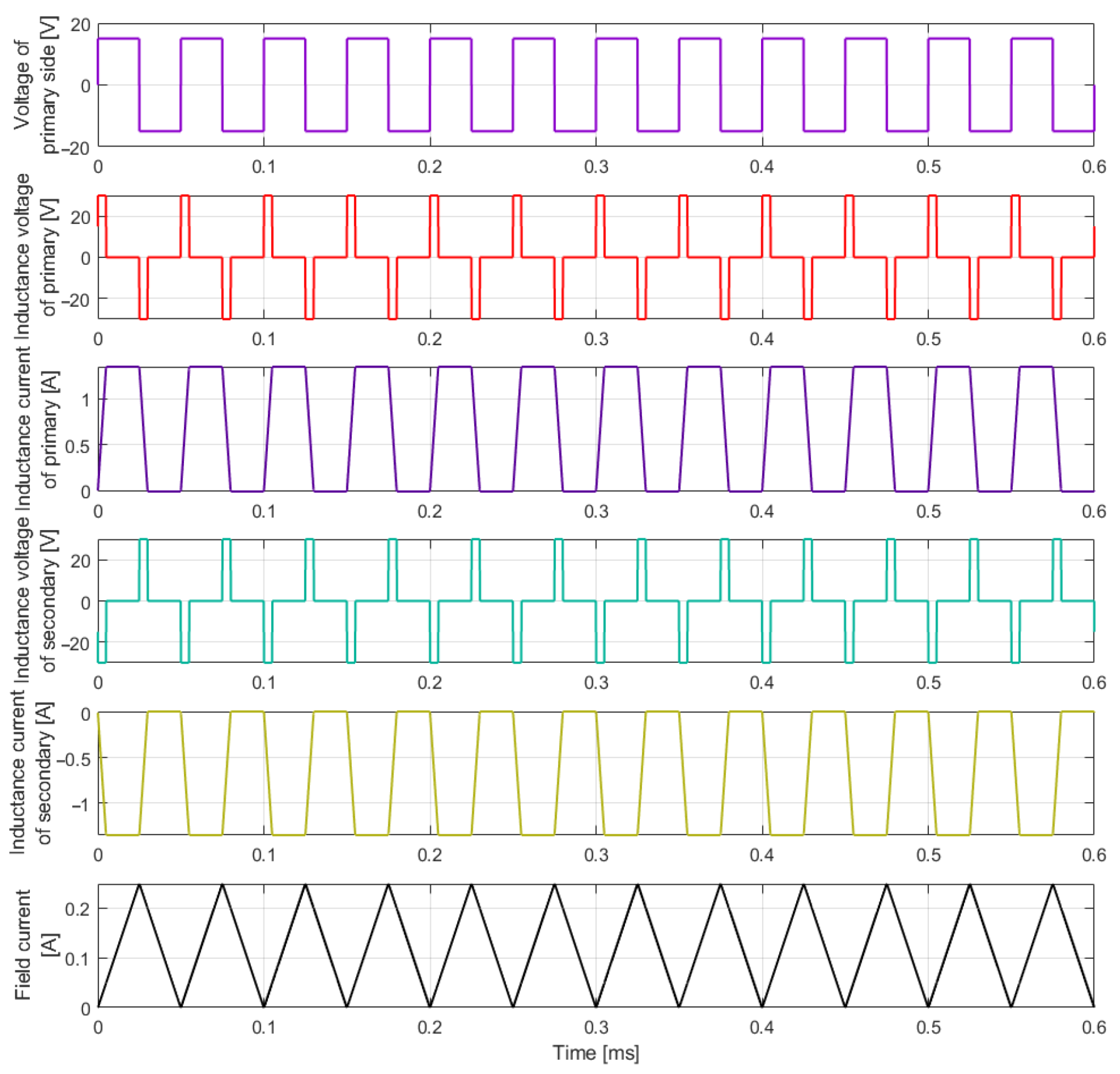 Figure 7 presents the steady-state waveforms from the time-domain simulation of the DAB converter, executed using the derived PHM. The waveforms provide a clear validation of the model’s ability to capture the fundamental energy dynamics and internal physical relationships of the converter. The quasi-square wave “Voltage of primary side” and the resulting multi-level inductance voltage act as the drivers of the system. In response, the primary and secondary inductor currents exhibit the characteristic trapezoidal shapes, with their slopes directly governed by the instantaneous inductor voltage, a behavior consistent with the PHM state equation ϕ ˙ L = v L . Crucially, the simulation also isolates the internal magnetic state, represented by the field current (magnetizing current, i m ). In the non-saturating regime, the model correctly predicts a pure triangular waveform, as the linear magnetic Hamiltonian ( H m a g ) dictates. The total inductor currents are a precise superposition of this internal magnetizing current and the power-transferring current component, demonstrating the model’s structural fidelity in representing the complete set of energy-conserving and dissipative interactions that define the converter’s operation.