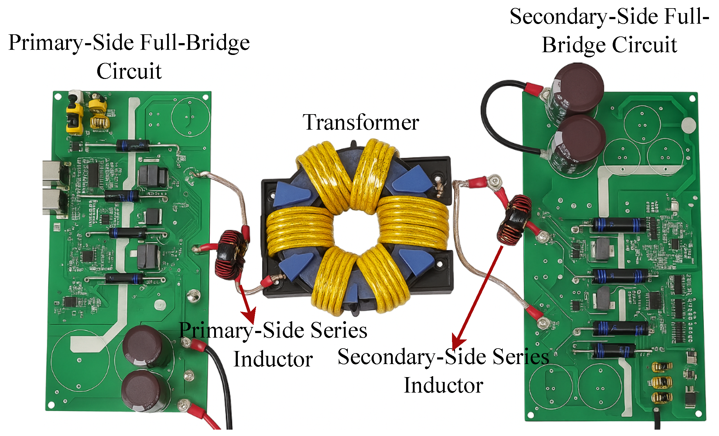 Based on the developed simulation model, a corresponding experimental platform was constructed, as illustrated in Figure 9. To ensure operational safety during testing, both the primary-side and secondary-side series inductors were implemented using air-core inductors. The experimental parameters are detailed in Table 1. The DC input was supplied by a Keysight-programmable DC power supply, and the output was connected to a DC electronic load operating in constant voltage mode to emulate a stiff DC bus. Under single-phase-shift (SPS) control at f s = 20 kHz, with turn ratio n = 1 , rated voltage V 1 = V 2 = 15 V, and phase shift D = 0.1 , the rated output power was 25 W. Subsequently, experimental waveforms were acquired and compared with the simulated results to validate model accuracy, as shown in Figure 10 and Figure 11.