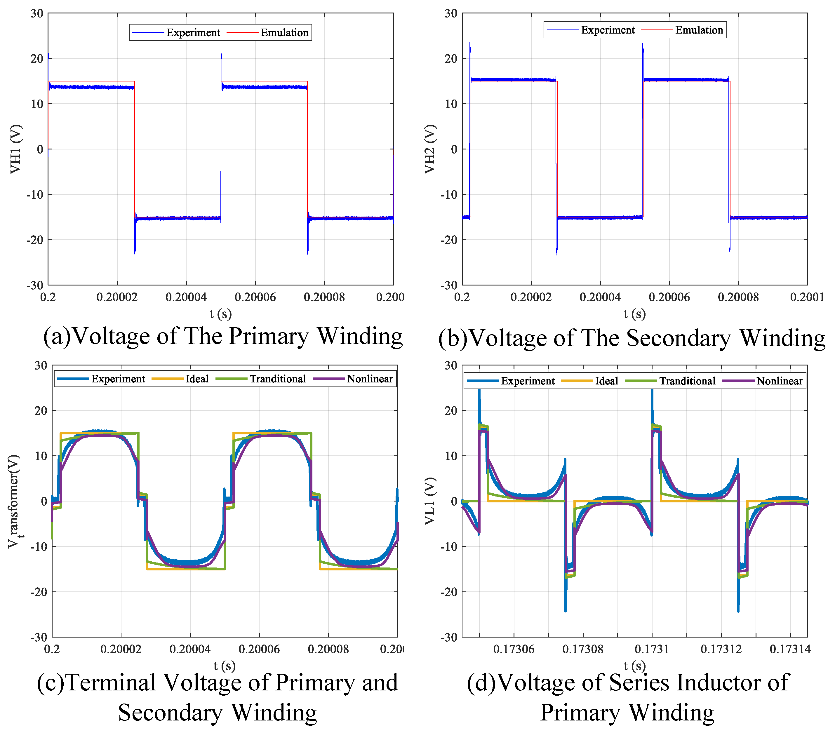 Figure 11c compares the measured terminal voltage of the transformer against the predictions of three distinct models. The ideal model predicts a perfect square wave, while the traditional linear model captures the fundamental shape but fails to replicate the subtle voltage drop and waveform curvature. In stark contrast, the proposed nonlinear PHM model demonstrates superior fidelity, accurately reproducing the nuanced shape of the experimental waveform. This accuracy stems from the model’s nonlinear magnetic Hamiltonian, H m a g , which correctly captures the relationship between magnetizing current and flux. This validation is further reinforced in Figure 11d, which shows the voltage across the series inductor, v L 1 . In contrast, the nonlinear PHM model is uniquely capable of predicting the subtle voltage droop and nonlinear curvature of the waveform, which are direct consequences of the saturation-induced magnetizing current. This exceptional correlation for the fundamental waveform shape underscores the model’s power in capturing the essential, non-ideal, coupled dynamics that govern the converter’s core behavior.