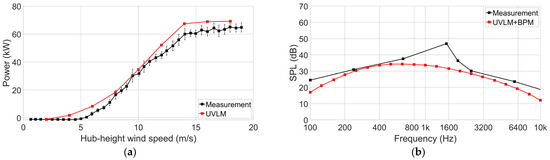 Validation against Atlantic Orient Corporation (AOC) 15/50 wind turbine measurements at the National Wind Technology Center, Colorado, USA. (a) Aerodynamic power; (b) Sound pressure level (SPL).