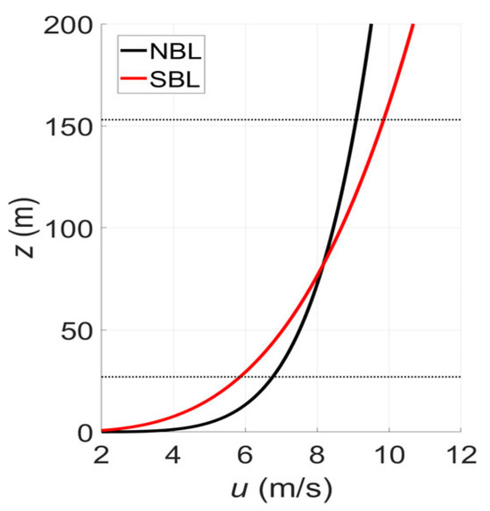 To account for the effects of different atmospheric stability, two freestream wind conditions—SBL and NBL—are considered. The specific freestream parameters are based on the LES study by Vollmer et al. [44] and are summarized in Table 2. These parameters are input to the Curl model to predict wake velocity fields according to yaw misalignment angles. The freestream velocity fields are generated from the hub height wind speeds and shear coefficients using a power law approximation as shown in Figure 3. In this study, only wind shear was considered in the freestream wind condition, while wind veer was assumed to be zero. The ambient streamwise turbulence intensity is used for turbulence model in Curl wake to calculate the wake dissipation.