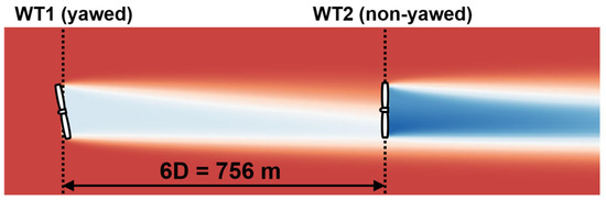 Simulation setup: two-turbine configuration. The turbines are spaced 6D apart, and yaw control is applied only to the upstream turbine.