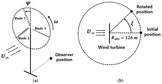 For the noise analysis, observer points are set to be located at ground level, at a distance equal to the rotor diameter (126 m) from the wind turbine location. Noise directivity is evaluated by rotating the initial observer point in 10° increments. The observing points for noise directivity relative to the wind turbine is illustrated in Figure 6, where the rotor azimuth angle and observer position angle are defined. The rotor azimuth angle is referenced when a blade is at the top of the rotor disk, and the observer angle is defined with respect to the downstream direction. Figure 6a depicts that the rotor blades rotate counterclockwise when viewed from the upstream side, as mentioned earlier. At the onset of each revolution, Blade 1 is positioned at , with Blade 3 and Blade 2 following sequentially at angular intervals of 120°.