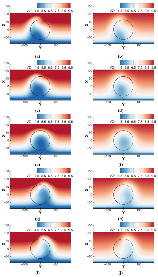 Predicted streamwise wake velocity fields at a location 6D downstream of the upstream turbine. (a) (SBL); (b) (NBL); (c) (SBL); (d) (NBL); (e) (SBL); (f) (NBL); (g) (SBL); (h) (NBL); (i) (SBL); (j) (NBL).