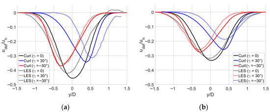 For the validation of predicted wake velocity fields, the normalized wake deficit and wake center position of the predicted wake and the referenced LES results [44] were compared. Figure 10 shows the normalized wake deficit distributions at hub height, predicted by the Curl model and LES, for SBL and NBL conditions. The normalized wake deficit was calculated by dividing the velocity deficit at each position at hub height—defined as the difference between the freestream wind speed and the streamwise wake velocity—by the freestream wind speed. The normalized wake center position was calculated by dividing the lateral position of the maximum wake deficit by the rotor diameter. Despite minor discrepancies, the magnitude of wake deficit and the location of wake center generally agreed well with the LES results, at different atmospheric stability conditions and yaw misalignment angles.