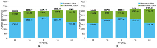 Time-average power of the upstream and downstream turbines. (a) SBL; (b) NBL.