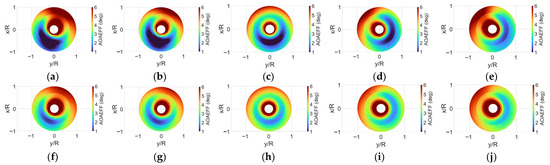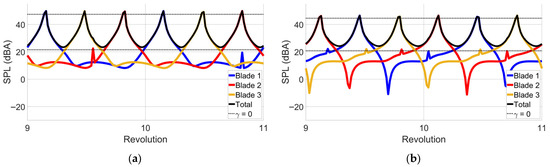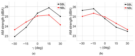 The partial wake caused by yaw control also intensifies the lateral asymmetry of the OASPL of the wind turbine under the partial wake. Figure 16 presents the difference in OASPL between receiver points located in the upper and lower semicircles of the noise directivity plot. For example, the value at represents the OASPL at the observer point located at minus the OASPL at the observer point located at . The observer point at is excluded because the trailing-edge noise emitted at this position is substantially lower than that at the other observer points. The results in Figure 16 indicate that, when viewed from upstream of the turbine, positive yaw increased the noise emission on the left side, whereas negative yaw increased it on the right side, especially for the upstream direction from the wind turbine (. This result corresponds to the fact that positive yaw deflects the wake to the right, whereas negative yaw deflects it to the left, which results in the asymmetric effective angle of attack distribution as depicted in Figure 13. Notice that the noise emission is already greater on the left side even with zero yaw. This is because, with the rotor blades rotating counterclockwise, the convective amplification effect at the upper semicircle is stronger than at the lower semicircle with respect to the observer point located at the ground level.