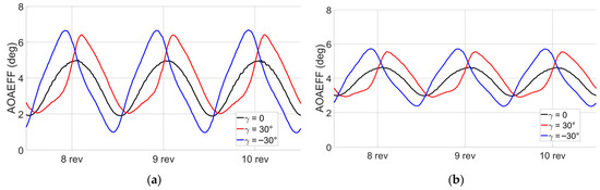 Time variation of effective angle of attack at with different yaw angles. (a) SBL; (b) NBL.