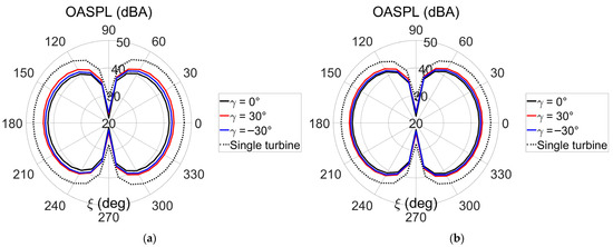 Overall sound pressure level (OASPL) directivity pattern. Single turbine indicates the upstream wind turbine with zero yaw under freestream inflow for each atmospheric stability condition. (a) SBL; (b) NBL.
