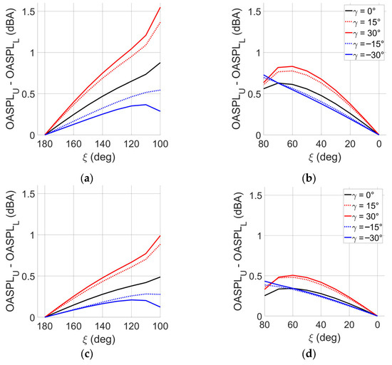Difference of OASPL of the upper and lower semicircle in the noise directivity plot. In each figure, the black solid line denotes zero yaw, the red dashed and solid lines denote +15° and +30° yaw, respectively, and the blue dashed and solid lines denote –15° and –30° yaw, respectively. (a) (SBL); (b) (SBL); (c) (NBL); (d) (NBL).