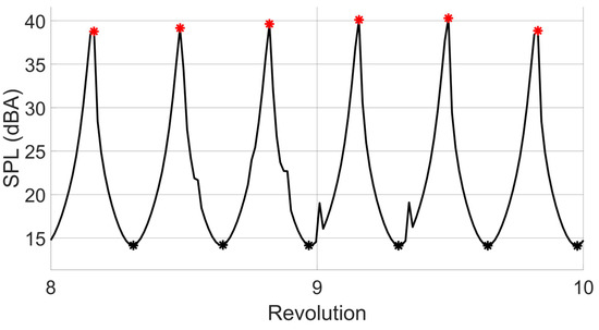 Initially, the OASPL, representing the time-averaged noise level at each observer location, was investigated. The OASPL was evaluated from the final 30 s of the simulation, after the wake had fully developed. At each time step, the BPM formulation was applied to compute the trailing-edge noise contributions from blade segments in one-third octave bands, which were combined at the observer position using the orthogonality of acoustic signals. The arithmetic mean of the resulting SPL values over the selected interval was then taken as the time-averaged OASPL. The OASPL directivity is depicted in Figure 15, with only the ±30° yaw cases included for clearer visualization. For baseline comparison of noise levels, the trailing-edge noise generated by the upstream turbine with zero yaw under freestream condition is also shown as black dotted lines. The observed pattern was consistent with the typical directivity of wind turbine trailing-edge noise, exhibiting lower sound levels in the crosswind direction and higher levels in the downwind direction. Regardless of the yaw angle, the downstream turbine emitted less trailing-edge noise than the upstream turbine, as the wake deficit led to smaller average inflow velocity and smaller average effective angle of attack and sectional wind speed, subsequently. For the downstream turbine, the OASPL increased with yaw misalignment, with a greater rise observed for positive yaw compared to negative yaw. This corresponds to the more rapid wake center displacement and greater wake deformation observed under positive yaw conditions. These results suggest that wake rotation affect the generation of trailing-edge noise as well. Also, the increase in OASPL by the partial wake was more prominent under SBL condition than NBL condition, which corresponds to the average power output results shown in Figure 12.