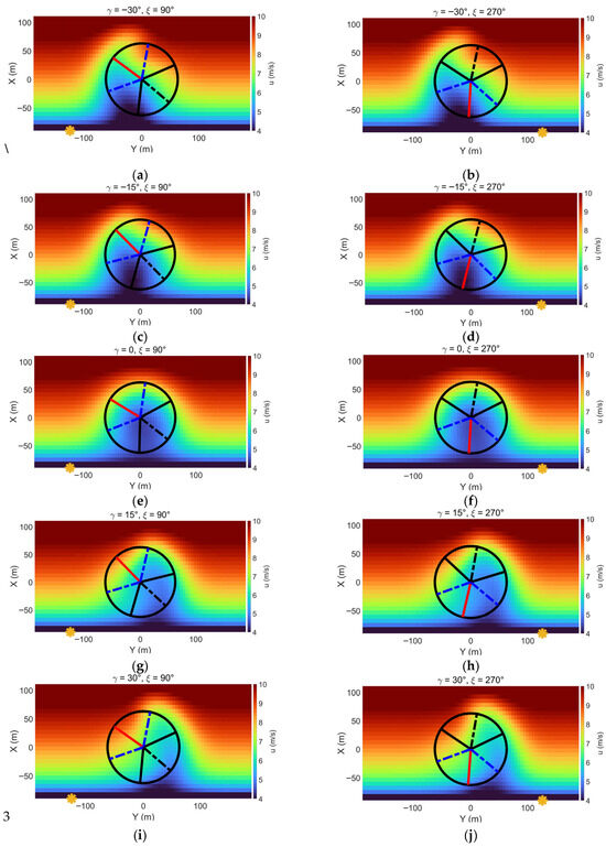 Effective angle of attack distribution with different yaw angles. (a) (SBL); (b) (SBL); (c) (SBL); (d) (SBL); (e) (SBL); (f) (SBL); (g) (NBL); (h) (SBL); (i) (NBL); (j) (SBL).