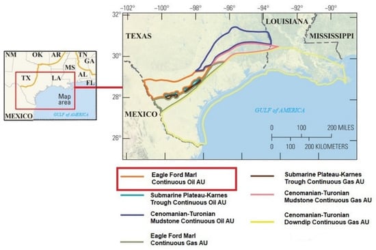 As part of its assessment of continuous (unconventional) petroleum resources in the United States, the USGS (United States Geological Survey) assessed the Eagle Ford Group and associated Cenomanian–Turonian strata with a focus on the technically recoverable resources within seven geologically defined assessment units (AUs). Whidden et al. [21] defined the AUs based on lithology, stratal thickness, thermal maturity, regional geologic features, and spatial distribution of productive fairways (Figure 2).