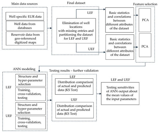 To obtain greater insight regarding existing DCA-based EURs for the Eagle Ford Shale, the approach developed in this study combines DCA estimations with the predictive capabilities of machine learning (ML) models. We started with a DCA-based EUR dataset from the U.S. Geological Survey (USGS) Eagle Ford Marl Continuous Oil Assessment Unit [21] and integrated these data with well-specific data and location-specific reservoir data to construct an extensive dataset that includes several variables that are likely to be important for production and the EUR. Using the final database of ~3000 wells, we developed artificial neural network (ANN)-based EUR prediction models for the lower and upper Eagle Ford Shale. In addition, we used trained and tested ANNs to estimate the sensitivity of EUR predictions to changes in different explanatory variables. To our knowledge, this is one of the few studies that explore EUR predictions for the Eagle Ford Shale using such an extensive dataset, and it is the only one studying lower and upper Eagle Ford Shale production zones separately using ML methods to predict EURs and explore their sensitivities to explanatory variables.