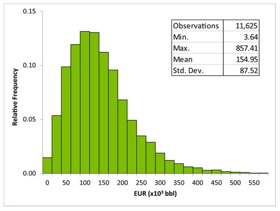 EUR histogram of wells (11,625) producing from the Eagle Ford Marl Continuous Oil AU, and the basic statistics of the distribution. The histogram was truncated after 600 × 103 bbl.