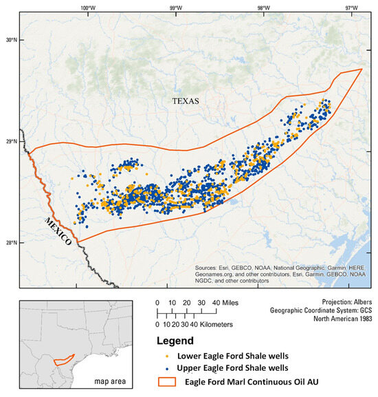 We used EUR data (for 11,625 wells) from the Eagle Ford Marl Continuous Oil AU. This AU contains carbonate-rich mudstones of the Eagle Ford Shale, and the term “marl” describes the lithology of rocks contained therein. The AU boundaries were determined by the United States–Mexico border, the 25% clay line separating the Eagle Ford marl (<25%) and Cenomanian–Turonian mudstone strata (>25%) to the northeast [29], and the thermal maturity window for oil (0.6–1.3 percent modeled vitrinite reflectance). Adjacent to this AU is the Submarine Plateau-Karnes Trough Continuous Oil AU, which is a zone of thicker Eagle Ford Group strata (greater than 120 feet), as mapped by Hammes et al. [25]. The 2018 USGS assessment interpreted this thicker interval to have enhanced source rock and reservoir potential [21].