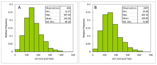 Figure 6A,B present the EUR histograms for the wells that produced from the LEF and UEF, respectively. It is important to note that our approach assumed production was solely from one interval without any contribution from the other. This meant that we assumed that the UEF did not contribute at all to LEF production despite wells that produced from the LEF having to pass through the UEF. Figure 6 shows that the distribution of EURs of the wells that produced from the LEF is similar to that for the UEF. The mean values were between 150,000 and 160,000 barrels (bbls) of oil, the minimum values were between 13,000 and 20,000 bbls, and the maximum values were between 407,000 and 420,000 bbls for the LEF and UEF, respectively, although the number of wells in the separate datasets for each interval was very different.
