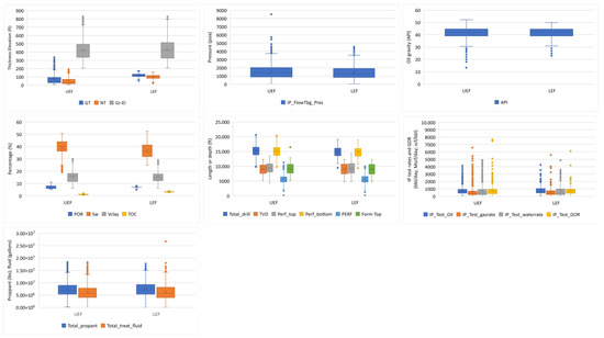 Table 1 and Table 2 display the basic statistics for well attributes and the reservoir properties at the locations of the wells that produced from the LEF and UEF, respectively. The results in Table 1 and Table 2 and Figure 7 suggest that most of the variables that reflect reservoir properties and the attributes of the wells producing from the LEF and UEF have similar values for data centrality (means and medians) and interquartile ranges (data dispersion) for both intervals. However, the ranges (maximum–minimum) and standard deviations (Table 1 and Table 2) exhibit some differences between the two intervals due to outliers shown in the box-and-whisker plots (Figure 7). Although they constituted a very small portion of the total amount of data, we did not remove these outliers, since they were not extreme outliers, and we did not have a reason to believe that these were erroneous measurements. Thus, we did not want to artificially skew the datasets or further reduce the number of observations.