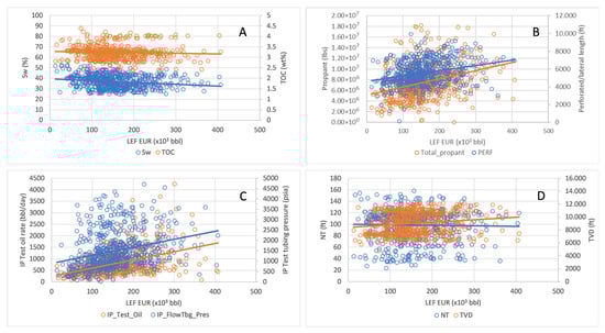The relationships between EUR and multiple well completion and reservoir parameters can be complex. Theoretically favorable reservoir properties, such as high TOC or porosity, low water saturation (Sw), or higher reservoir thickness, could be expected to be positively correlated with EUR [25,35]. Similarly, well attributes, such as longer lateral sections or larger amounts of proppant use (indicating more intensive fracturing), could be expected to be positively correlated with EUR. In addition, greater IP test tubing pressure (as an indicator of higher reservoir pressure and thus more efficient fluid delivery for the producing life of the well) or IP test oil recovery may be expected to be positively correlated with EUR. We plotted the univariate correlations of these variables with the decline-curve EURs of wells that penetrated the LEF and present the plots in Figure 8. While these plots do not show the expected positive correlation between EUR and TOC (Figure 8A), in general, they do suggest slight negative correlation between EUR and Sw (Figure 8A), and positive correlations between EUR and IP test pressure and oil flow rate (Figure 8C), as well as between EUR and lateral wellbore length and total proppant used (Figure 8B). On the other hand, the univariate correlations between EUR and TVD appear to be slightly positively correlated, while net thickness (NT) of the LEF appear to be uncorrelated (Figure 8D). However, it should be noted that, although Figure 8 may provide some indication of the importance of these variables for predicting EUR, the explanatory power of any single variable is very limited, and the plots should not be considered as explanatory of all the variance in EUR attributable to each independent variable. Because EUR is explained by multiple variables and their interactions, the univariate correlations (or lack thereof) shown in Figure 8 may be due to other variables that are not included in one of the plots.
