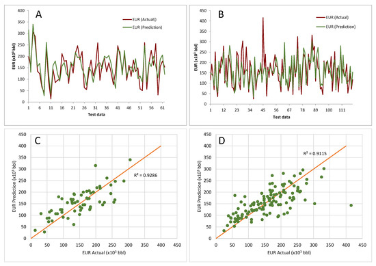 Comparison of target (actual) EUR values of the testing dataset with the predictions of the ANN models ((A): LEF; (B): UEF), and the regression plots of the actual EUR values with the predictions ((C): LEF; (D): UEF).