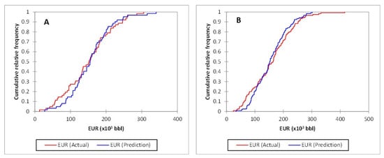 Cumulative distribution functions of actual (decline-curve-based) and ANN-predicted EURs for wells penetrating the LEF (A) and UEF (B) intervals.