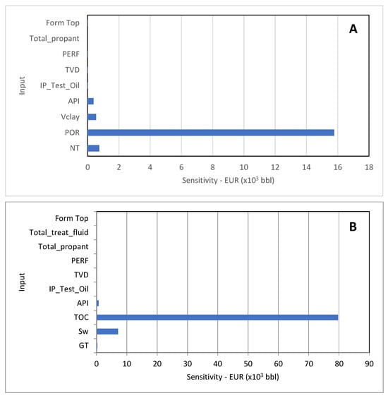Finally, we tested the models for sensitivities about the mean values of the input parameters. In these tests, the value of the parameter being tested was varied one standard deviation about its mean value, while that of all other parameters were held fixed at their mean values. Figure 11 shows that the EUR predictions for the LEF model were most sensitive to changes in porosity, net thickness of the interval, clay volume, and the API gravity of the oil. The EUR predictions for the UEF model were most sensitive to changes in the TOC and water saturation. In the case of the LEF, which is the main source of Eagle Ford production [35], we found that changes in porosity and net thickness had the greatest impact on predictions of EUR. Hou et al. [1] indicated that these parameters were highly correlated with reservoir capacity and hydrocarbons in-place in the Eagle Ford Shale. In other applications, Ver Hoeve et al. [55] demonstrated that they could also be useful for identifying sweet spots in shale reservoirs. Hammes et al. [25] found that porosity exhibited a strong correlation with productivity in most of the Eagle Ford shale play, except in Dewitt, Karnes, and Webb Counties, but the lower correlations there could have been owing to other factors (such as low TOC). In addition, porosity and clay volume may impact permeability, which along with API gravity of the oil impacts deliverability. Therefore, the variables we found to be most important for production and EUR of the LEF in this study could be owing to them being mostly related to reservoir capacity and deliverability.