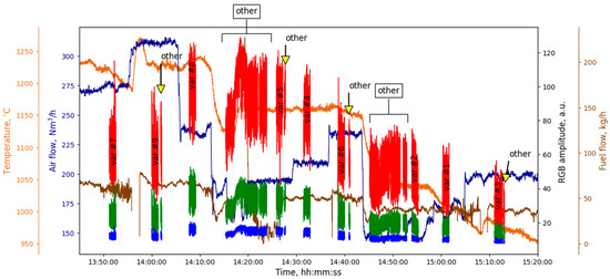 The exact moments at which recordings for each combustion variant were made are depicted in Figure 2 as the mean values of the R, G, and B components of individual image frames. The extra flame images have been captured as well. The additional data marked as “other” were collected throughout the entire experiment timeline in a total of 11 separate recordings of various lengths. All the data were merged into one set that represents not any of the defined variants and is the so-called “other” variant. The recordings were made shortly after each of the defined co-combustion variants or during transition from one of the defined process states to the other. Detailed information on their occurrence in time is presented in Figure 2.