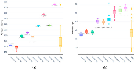 Boxplots of the main combustion process parameters corresponding to each combustion variant and the “other” combustion state. The black dotted lines represent the reference values of air and fuel flows for each variant collected in Table 1. (a) The total air flow; (b) the fuel flow.