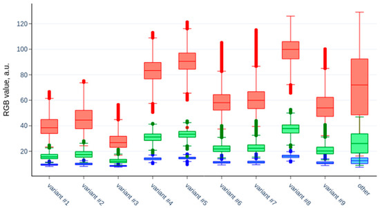 Figure 4 and Figure 5 illustrate the variability of flame images for the 10 classes considered, but in different ways. Figure 4 shows basic descriptive statistics of RGB component brightness in the form of a box plot, where the median, brightness spread in the form of interquartile range, and outliers are visible.