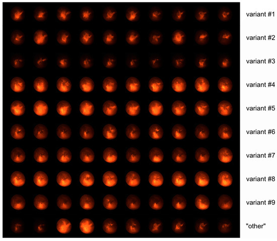 The data, comprising a total of 110,880 images with timestamps and co-combustion variant identifiers (variant #1–variant #9), were stored in a single file. Each variant was represented by 12,000 frames, except variant #3, for which 14,880 frames were collected. Images belonging to the “other” variant were collected in a separate file, containing 139,632 images. Because the dataset containing additional image frames has a significantly higher number of entries, 12,320 were randomly selected from the dataset and merged with the data containing images of the defined nine variants. The number of images for each variant, including the “other” category, was similar. All the images have been stored as 24-bit RGB, with a resolution of 800 × 800 pixels.