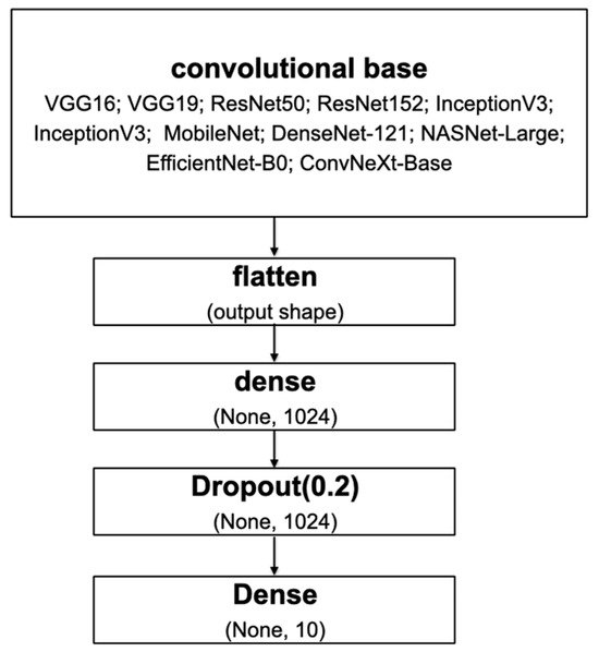 The learning phase is followed by applying the convolutional base of one of the mentioned CNN architectures atop a separate classifier, as shown in Figure 6. The classifier consists of two dense and one dropout layers. The first approach was the transfer learning (TL) technique, which consists of “freezing” the pre-trained convolutional base and training the classifier only. It significantly reduces the time needed for training, especially for complex architectures. The convolutional database was trained using the ImageNet dataset, containing 1.4 million images of everyday objects (e.g., chairs, cars, people) grouped into 1000 categories [49]. The image dataset collected during the co-combustion experiment has completely different content compared to ImageNet. That was the reason for examining the second approach of training the CNNs from scratch [50].