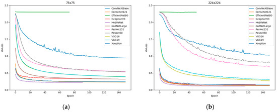 Figure 7 presents validation loss plots for the lowest (75 × 75) and the highest (224 × 224) tested input image resolutions. The figures reveal the effects of applying the transfer learning paradigm for all the CNNs tested.